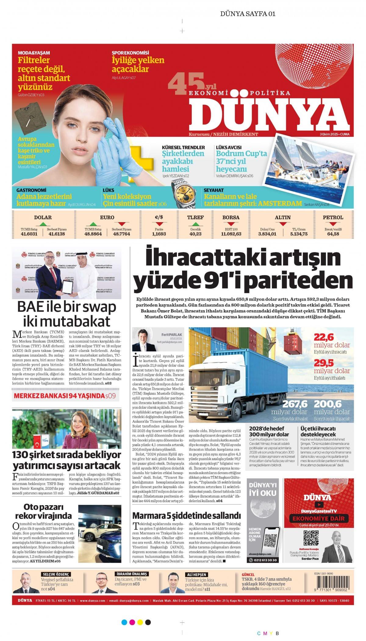Dünya Gazetesi 3 Ekim 2025 Günü Manşeti