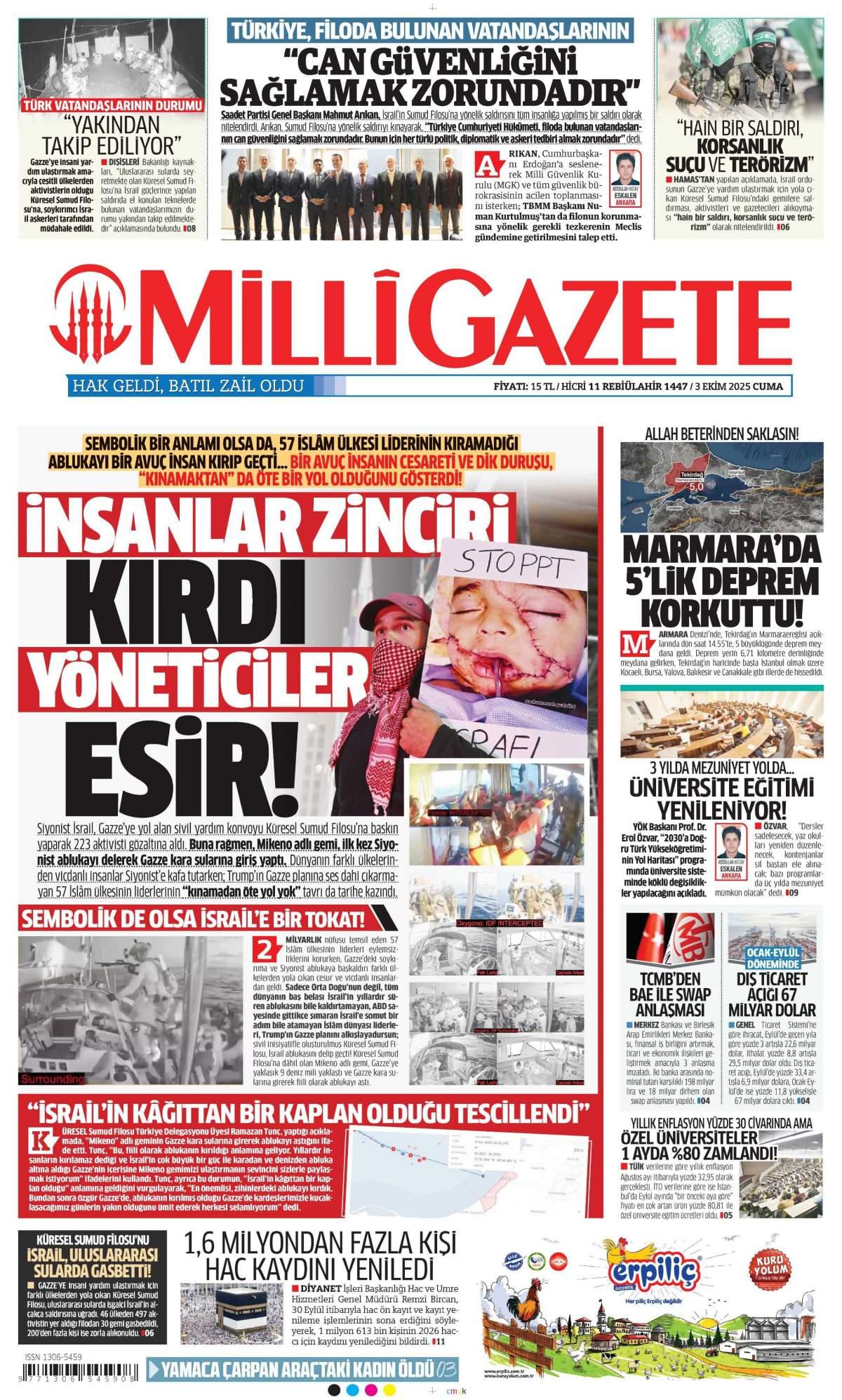 Milli Gazetesi 3 Ekim 2025 Günü Manşeti