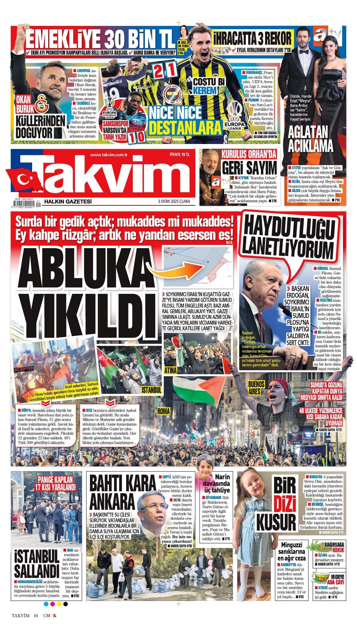 Takvim Gazetesi 3 Ekim 2025 Günü Manşeti