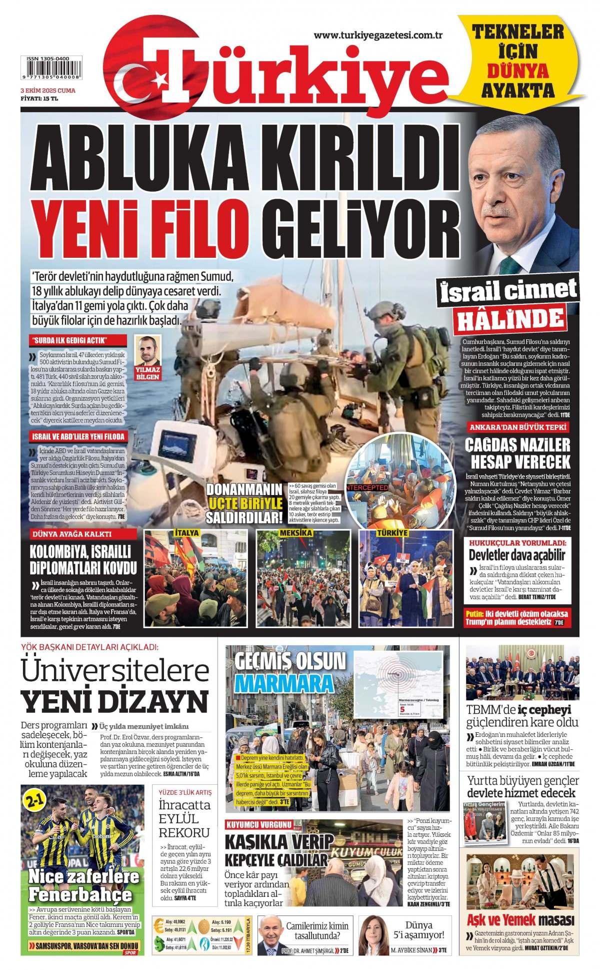 Türkiye Gazetesi 3 Ekim 2025 Günü Manşeti