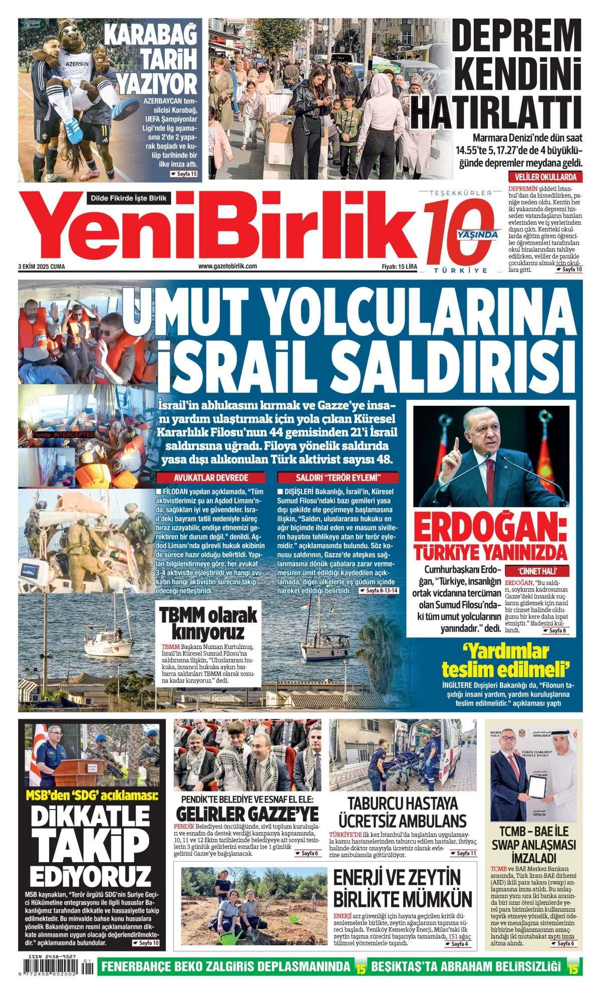 Yeni Birlik Gazetesi 3 Ekim 2025 Günü Manşeti